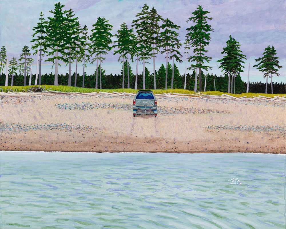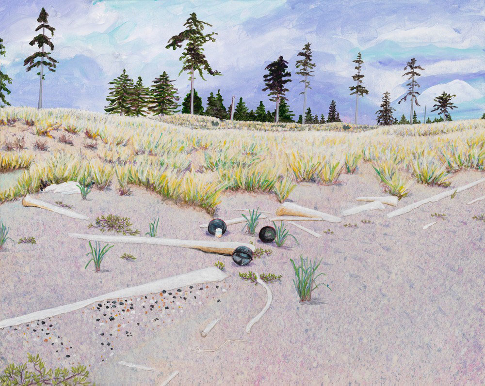 "On Pesuta Beach, one appreciates the sunny, beaten gravel coast that separates the green jewels of the rain forest from the sea. Thanks to Gladys for not making me carry the Japanese float (many of which litter the beach) all the way back to the art studio and for the great adventure crossing the Tlell River at low tide and for sharing the first fish we got, the one that the eagle sent me."