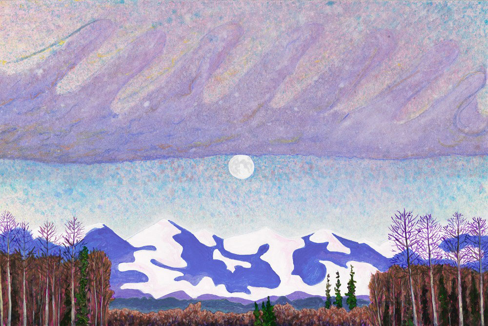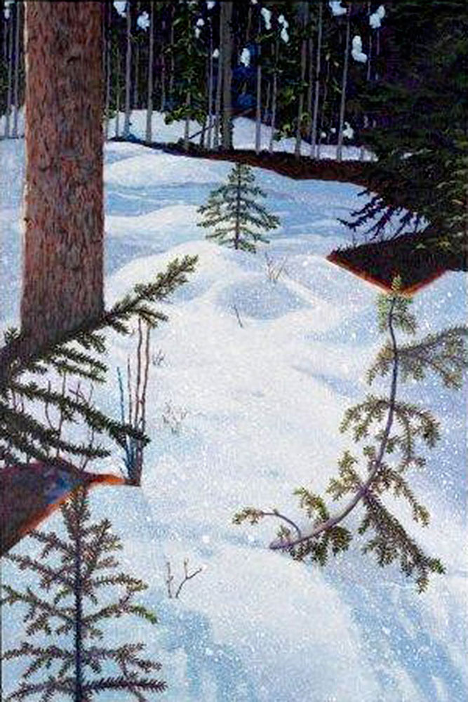 “Walking in the forest behind our log cabin, the sun glittered in the snow, causing the sparkles in the snow to glitter with rainbow colours. What can one say to that beauty? And what medium, if any, can capture it?”