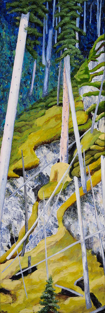 "Trees baffle me. How can they grow on straight rock? This north facing slope is located off of the forestry truck road in central Alberta, east of Mountain Aire Lodge in the Rocky Mountain Foothills. The moss forms a thick blanket that covers the bedrock, with the exception of a few outcrops. So neither the moss nor the struggling white spruce and lodgepole pine have much to support them, structurally or for nutrient supply."